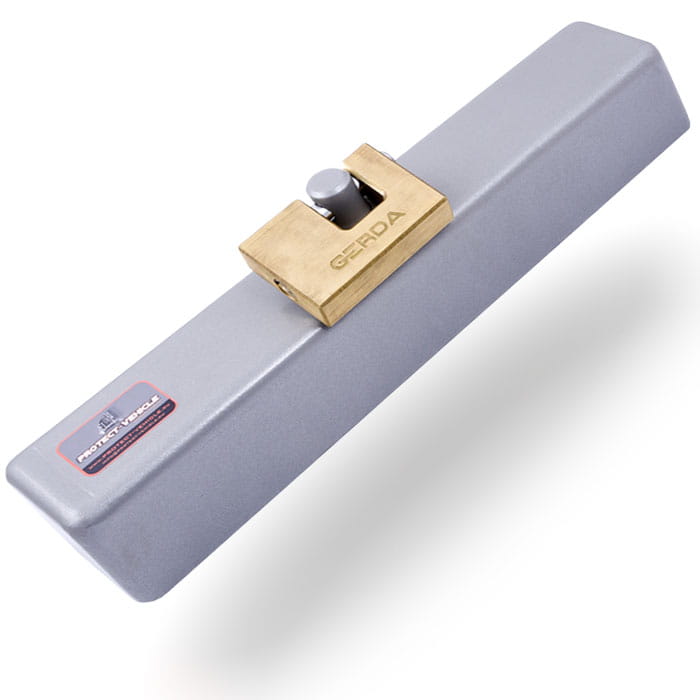 Kłódka zastosowana w PV-12/P SR2 FUTURA GERDA jest produkowana przez renomowaną firmę GERDA. Jest wykonana z mosiądzu, odporna na wilgoć i próby włamania. Posiada kilkaset tys. kombinacji klucza. Możliwość zastosowania systemu jeden klucz - wiele urządzeń. Trzpień zamykający w kłódkce jest wykonany z utwardzonej stali (hardened) Zabezpieczenie stosowane jako dodatkowe zabezpieczenie naczep typu SR2 LAMBERET FUTURA w bazach przeładunkowych oraz w czasie jazdy.