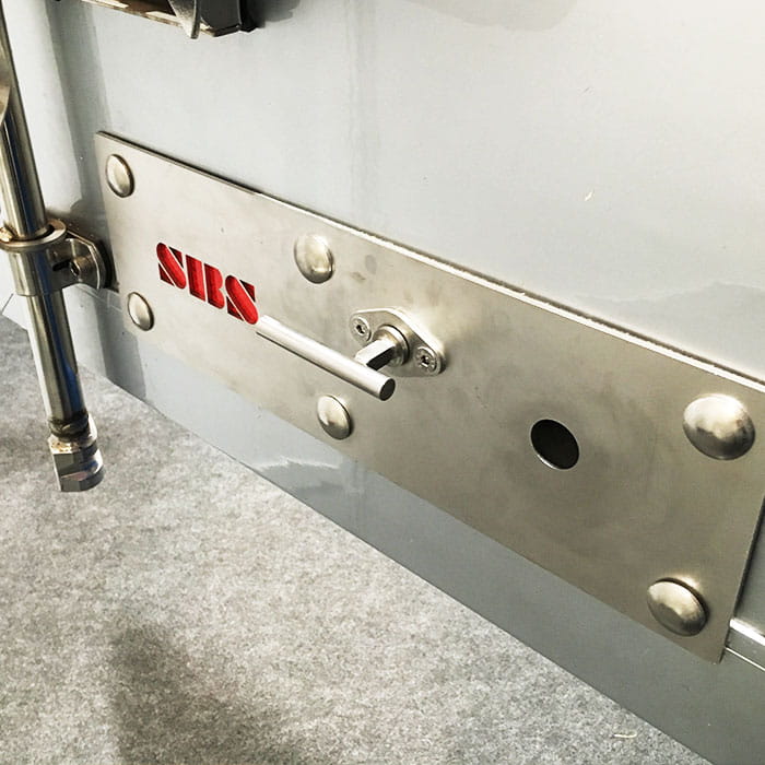 SBS INLOCK Basic - blokada wewnętrzna (mechaniczna manualna) montowana na stałe, blokująca prawe drzwi naczepy na pomocą 2 sworzni (20 mm) wchodzących w ramę naczepy.